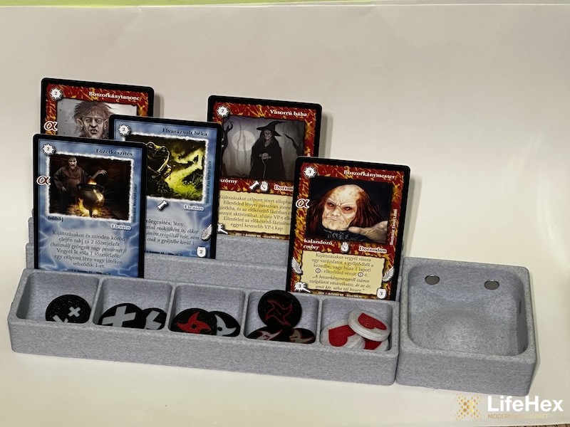 Három sorban tarthatod rajta a kártyáidat (így akár tucatnyi kártyát láthatsz egyszerre), az öt rekeszben pedig a különféle tokenek, kockák remekül elférnek.