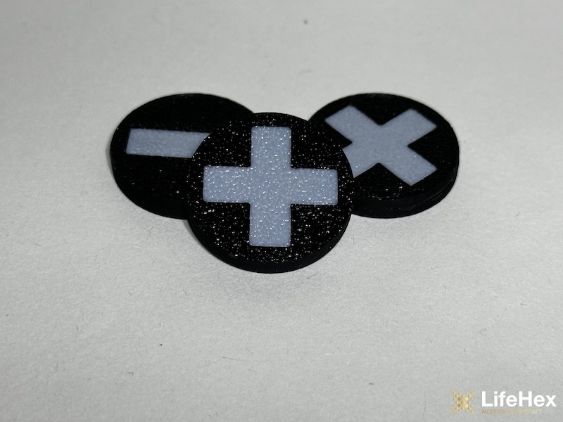 Kétoldalú, egyik oldalán fekete alapon fehér PLUSZ (avagy "X"), másikon fehér MÍNUSZ módosítót ábrázoló tömör token. Magic: the Gatheringhez, HKK-hoz, egyéb gyűjtögetős kártyajátékokhoz tökéletes.