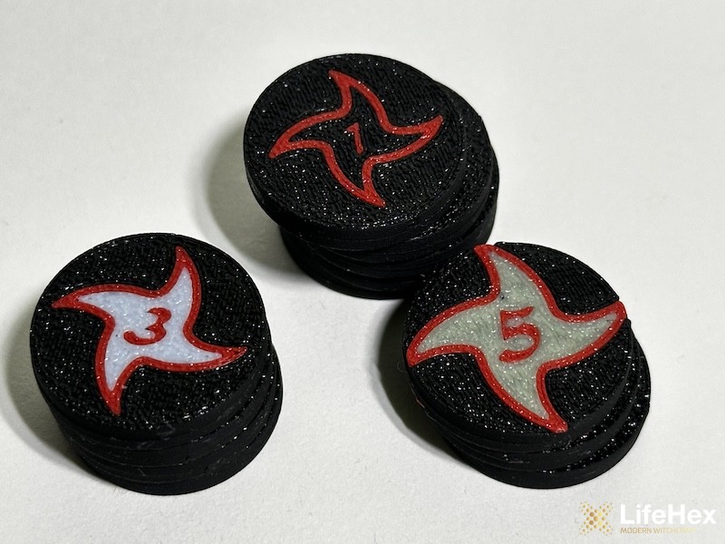 Minden játékhoz remekül használható sebzésjelölő zsetonok 1, 3 és 5-ös értékben. Összesen 20 zseton, 42-es összértékben.