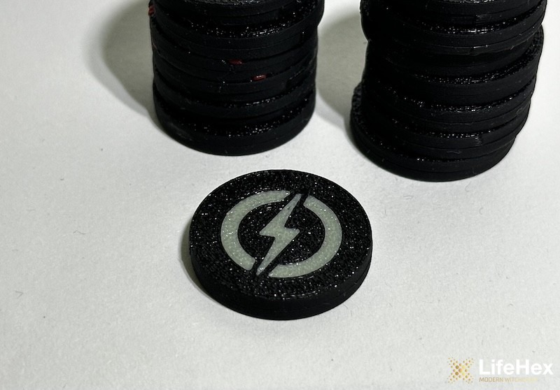 Kétoldalú, mindkét oldalán fekete alapon sárga villámot ábrázoló tömör token. Általános jelzőként is tökéletes, de sok játéknál (pl. Keyforge, Magic: the Gathering, stb) jöhet jól stunned, paralizált, stb állapot jelzésére. Szintén hasznos lehet pl. HKK-hoz varázspont számolásra.