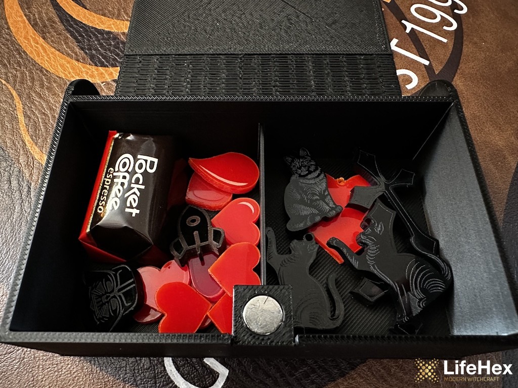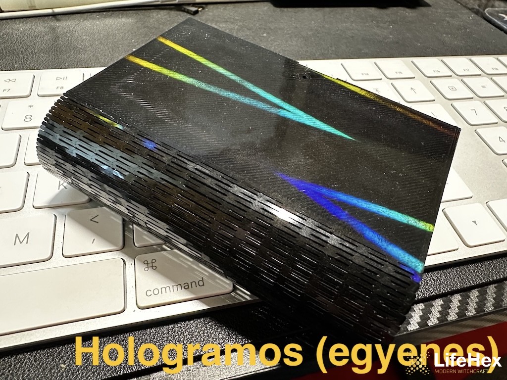 "Flexi" gerincű 3D nyomtatott kinyitható doboz 2 rekesszel, mágneses zárral. A borító, a gerinc és a doboz alja lehet hologramos hatású, karbon mintás vagy textúrált. A fotókon láthatsz mintákat, megjegyzésben jelezd hogy melyiket szeretnéd!