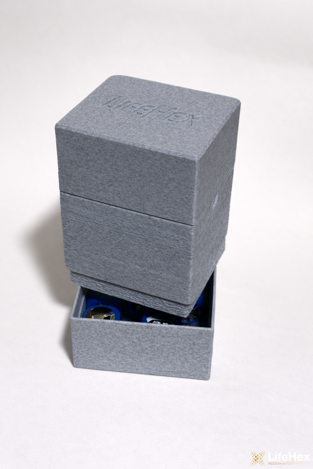 A dobozban 100 darab védőzött kártya fér el (vékonyabb kártyavédővel még több). A doboz bővíthető egy újabb tető / alsó tárolóhozzáadásával, ami ekkor a doboz aljára helyezhető és tárolóként működhet kockáknak és tokeneknek.