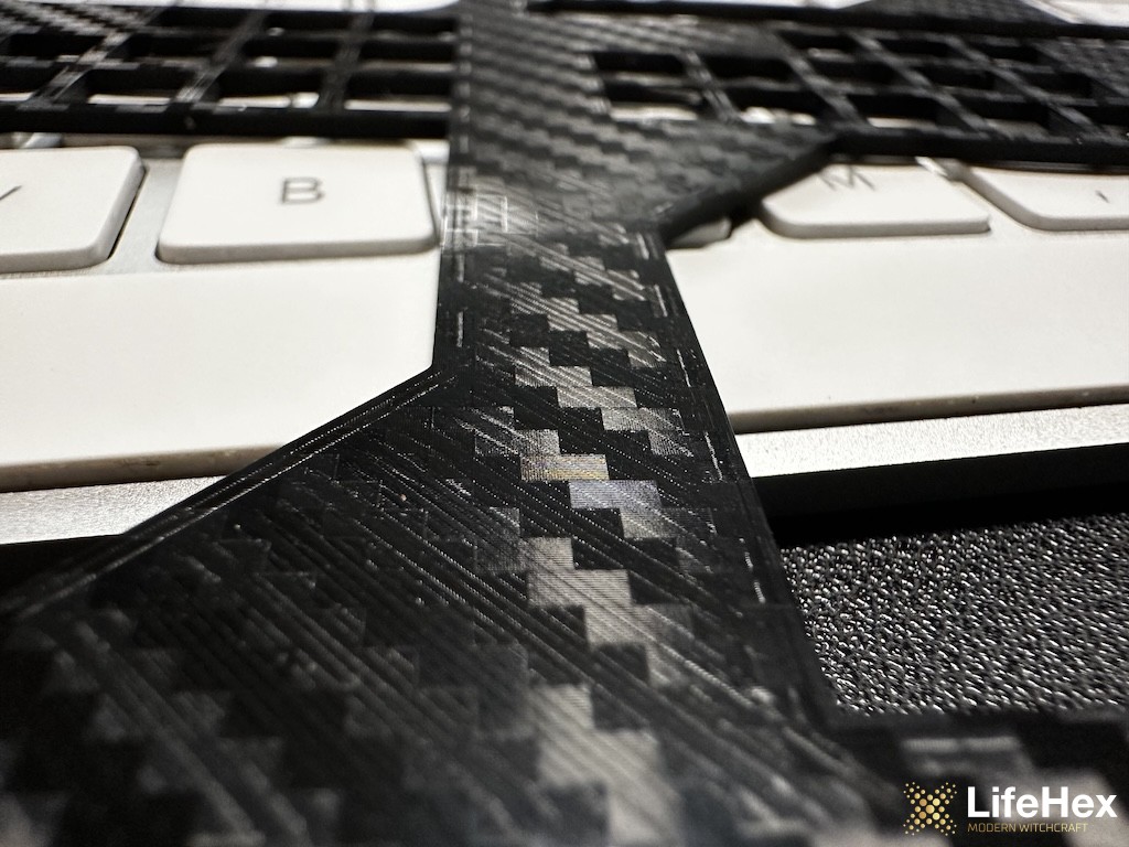 A felső rész tükörsima, carbon mintájú 3D nyomtatott lemez, az alsó pedig lézerrel gravírozott fa. Tartós, látványos, különleges.
