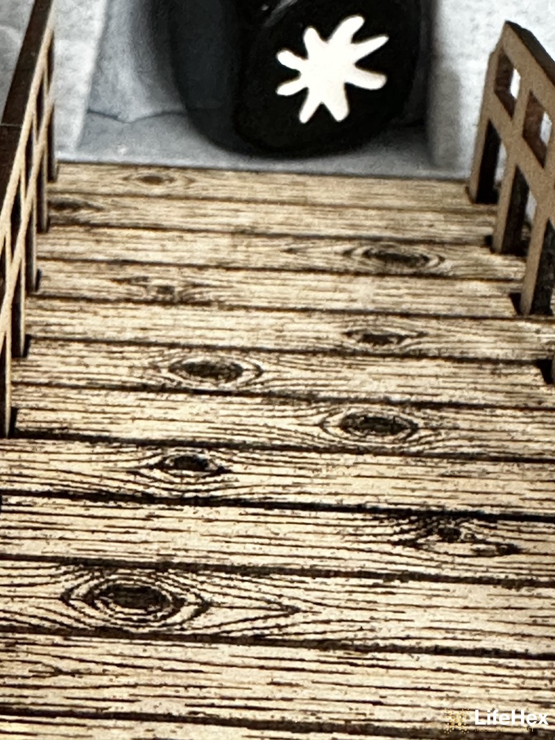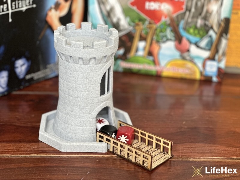 Igazán különleges kockatorony, ami minden társasjáték mellett feldobja az asztalképet! A 3D nyomtatott bástyában egy meredek csigalépcső segít a kockáknak villámgyorsan leérni a fából készült, korlátokkal szegélyezett hídra.
