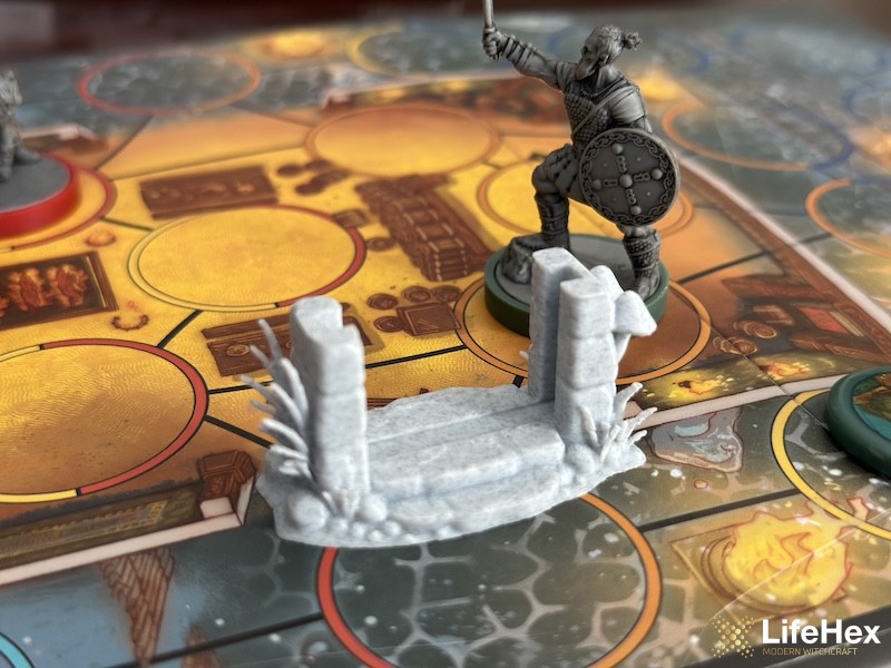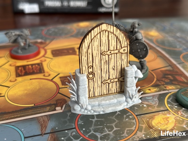 "Multimaterial" 3D nyomtatott és fa, középkori/fantasy hangulatú ajtó az Unmatched: Piroska és Beowulf doboz kunyhós pályájához tervezve. Mindkét oldalon mintával!