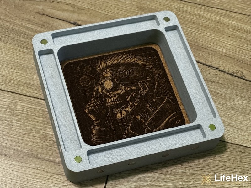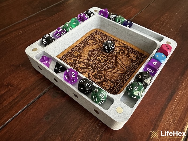 Ha te is unod az asztalon szanaszét guruló, mindent felborító, asztal alá lezuhanó kockákat, akkor a megoldás ez a 3D nyomtatott kockadobó tálca lehet. A lézerrel gravírozott, vagány mintás parafa borítás gondoskodik a diszkrét hanghatásokról, az oldalakon körben található mágnesek pedig a tokentartó tálcáinkkal való vajsima, mégis stabil kapcsolódásról. A doboz felső oldalának sarkaiban is található négy mágnes (ezekkel együtt összesen 20 darab neodímium földfémmágnest tartalmaz a tálca!), amik az opcionálisan külön megvásárolható tetőt tartják megbízhatóan a helyén, így a kockák szállítására is alkalmas.