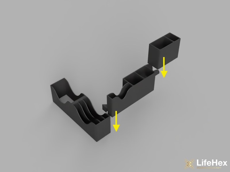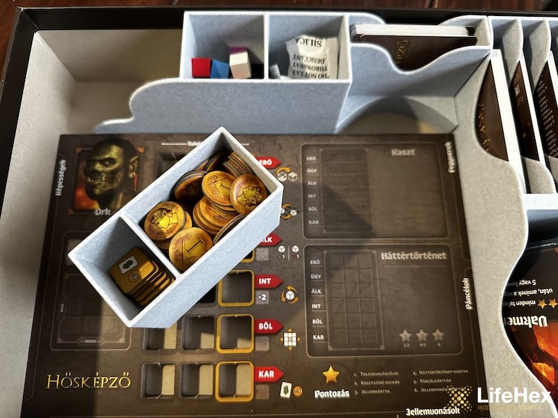 A gyári, vékony papír helyett tartós és jól használható 3D nyomtatott rendező a Hősképző (születési nevén Roll Player) társasjátékhoz. A rendező több rekeszt kínál a különféle típusú kártyáknak, a játék közben gyakran használatos arany- és karizmatokenek pedig egy kivehető rekeszben tanyáznak, így a játék előkészítése villámgyors, az asztalon pedig csak annyi helyet foglal amennyi tényleg muszáj. A játék elpakolása szintén sokkal gyorsabb, pár mozdulattal visszarendezhető mindegyik alkatrész.