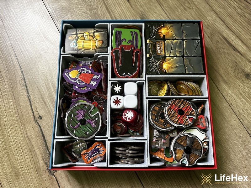 Moduláris társasjáték-rendezőnk a Cora Questhez igazítva. Összesen 8 rekeszt tartalmaz különféle méretekben. A rekeszek magassága a játék dobozának belmagasságához igazodik, így a doboztetőt rátéve a komponensek a rekeszekben maradnak.