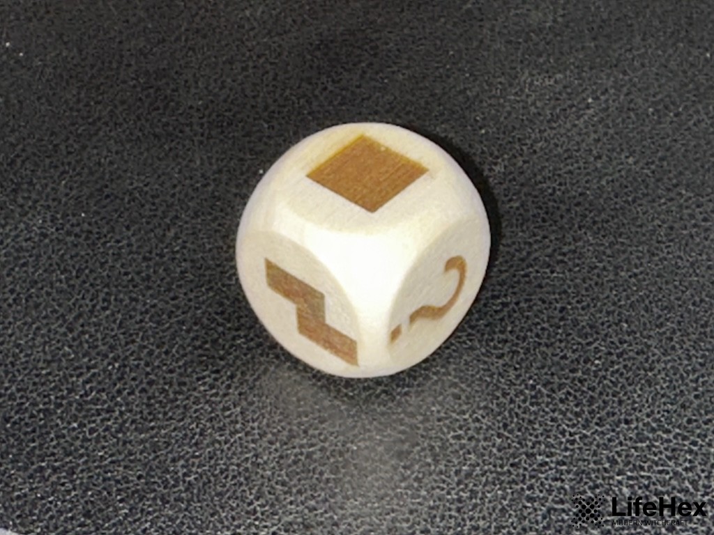 Fából készült kocka a Tetris elemeivel plusz egy kérdőjellel az oldalain. Remekül használható az "ingatag Tetris" játékhoz.