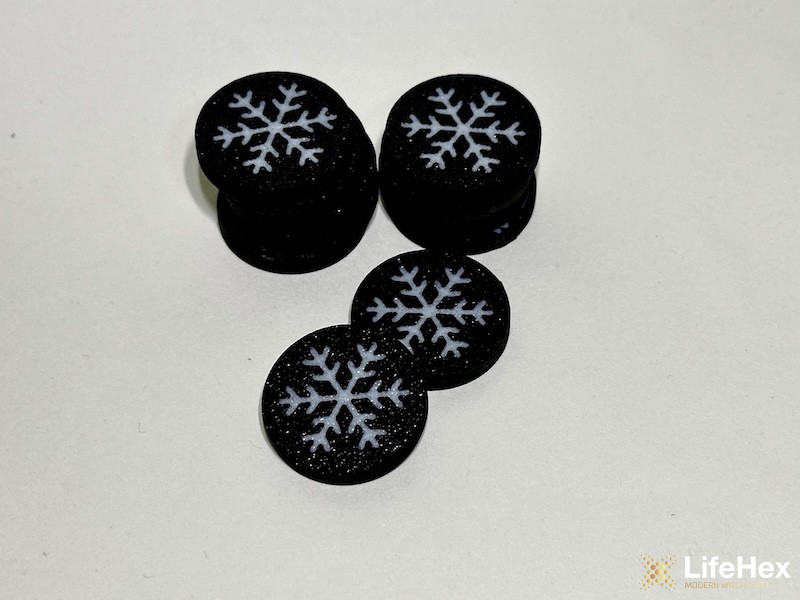 Kétoldalú, mindkét oldalán fekete alapon fehér hópelyhet ábrázoló tömör token. Általános jelzőként is tökéletes, de fagy/freeze jelzőként különösen remek.
