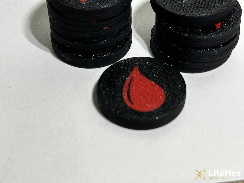 Kétoldalú, mindkét oldalán fekete alapon piros vércseppet ábrázoló tömör token. Általános jelzőként is tökéletes, de sebzés jelzőként is remek (bár arra van külön sebzés tokenkészletünk).